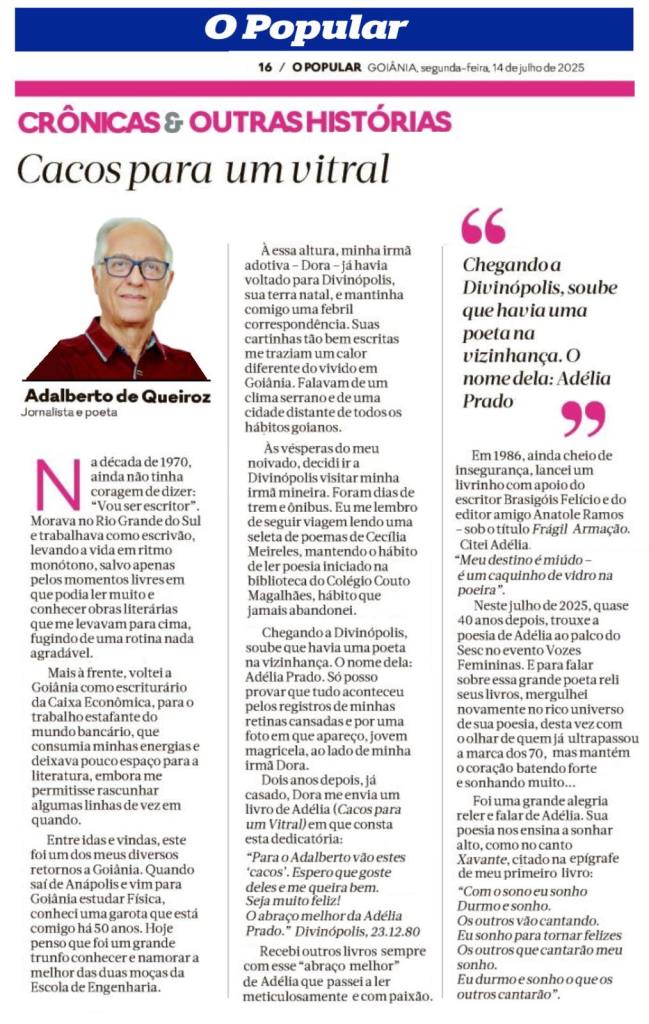 Seguiram-se outros livros sempre com esse “abraço melhor” da poetisa Adélia que passei a ler meticulosamente e com paixão. Em 1986, cheio de insegurança, lancei um livrinho com apoio do escritor Brasigóis Felício e do editor amigo Anatole Ramos – sob o título Frágil Armação. Citei Adélia. “Meu destino é miúdo/é um caquinho de vidro na poeira”. Aquele menino continua acreditando nisso e sonhando alto, como no canto Xavante, citado como epígrafe: