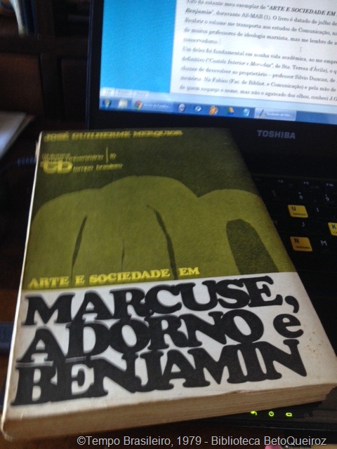 (1) MERQUIOR, J.Guilherme. “Arte e Sociedade em Marcuse, Adorno e Benjamin (ensaio crítico sobre a escola neohegeliana de Frankfurt)”. R de Janeiro, GB., Tempo Brasileiro, 1969. Curriculum de J.G.Merquior – site da ABL.
