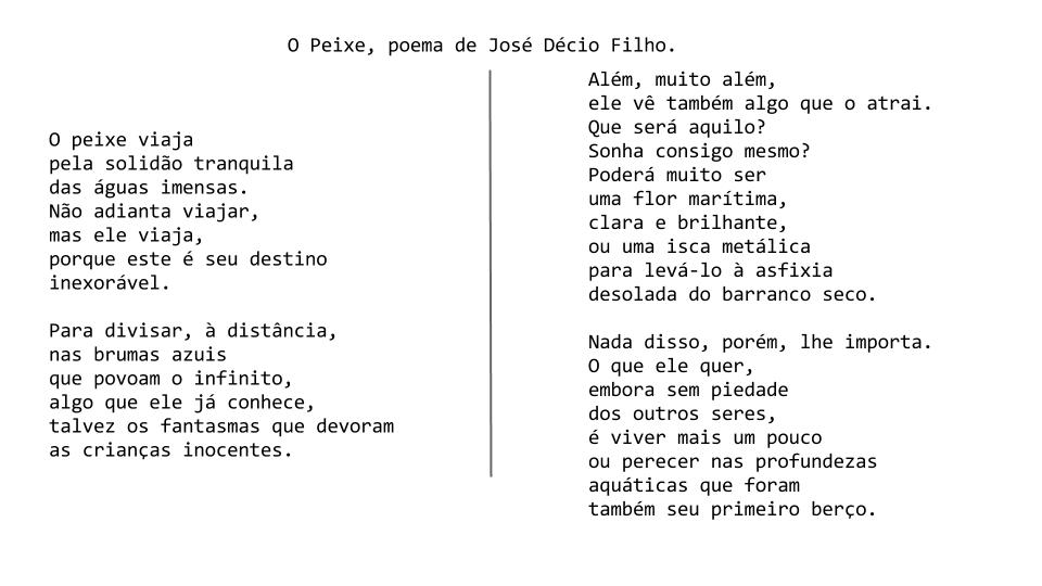 E para os que não tiveram a oportunidade de viver o momento de “remembrances” de José Décio, deixo essa transcrição do Poema “O Peixe”, esperando vê-lo(a) como leitor da bela poesia Deciana, que merece sim percorrer longos e novos Caminhos. Não sem antes dizer-lhes, repetindo o crítico e amigo do poeta (Oscar Sabino Jr.): “A poesia parecia a ele [J.Décio], como também pareceu a Rainer Maria Rilke (o canto é a existência) um processo da existência em ação e, por isso, distante do pensamento participante… Para ele, como para Rilke, a poesia era uma escolha de destino exigente dos maiores sacrifícios.”