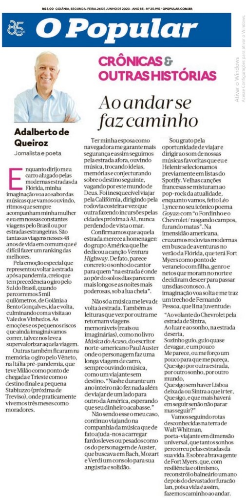 Vamos seguindo rotas desconhecidas na terra de Walt Whitman, poeta-viajante em dimensão universal, que tantos sonhos percorreu pelas estradas da sua vida. E sobre a brava gente de Fort Myers, que, com resiliência e otimismo, reconstrói o balneário um ano depois do devastador furacão Ian, pois a vida é assim, fazemos caminho ao andar.