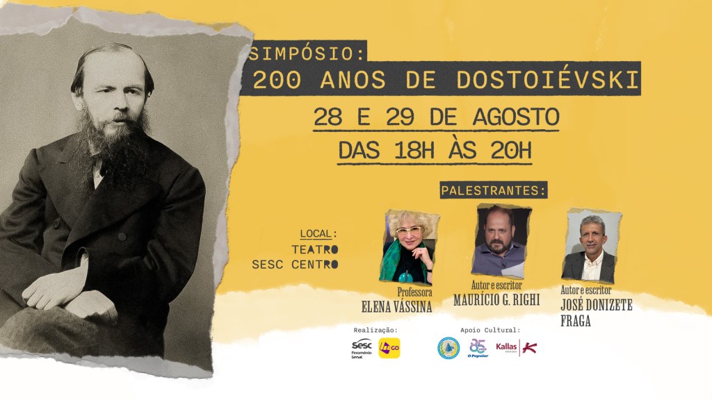 Tenho a honra de coordenar este projeto que traz o patrocínio do SESC/GO – Fecomércio. Um evento inédito em Goiânia, que reúne palestrantes de renome em torno de um escritor que, segundo o emérito crítico Otto Maria Carpeaux “é, senão o maior, decerto o mais poderoso escritor do século XIX; ou do século XX, pois a sua obra constitui o marco entre dois séculos de literatura”. E prossegue: “Literariamente, tudo o que é pré-dostoievskiano é pré-histórico; ninguém escapa à sua influência subjugadora, nem sequer os mais contrários”.