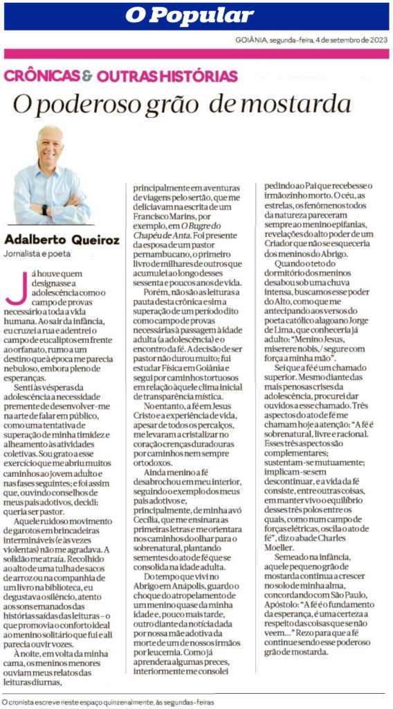 Semeado na infância, aquele pequeno grão de mostarda continua desejoso de crescer no solo de minha alma. Afinal, certo está São Paulo, para quem “A fé é o fundamento da Esperança, é uma certeza a respeito das coisas que se não veem…” Rezo para que a fé continue sendo esse poderoso grão de mostarda.