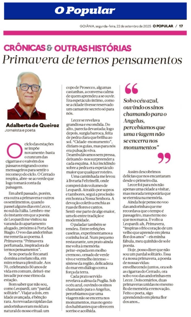 Hoje, posso dizer que não sou um pardal solitário. Esta é a nossa primavera, a poesia de nossas vidas: envelhecendo juntos, ora sob as cigarras do Cerrado, ora sob o voo das andorinhas em Lecce. Dois cenários, duas primaveras unidas no mesmo fio de memória e renovação. Feito o poeta, sigo aprendendo em plena flor dos anos…