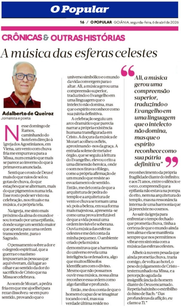 Ao sair da igreja para enfrentar o tempo fechado que prometia chuva, tinha a certeza de que o mundo ainda tem alma e ela se manifesta sempre que nos permitimos vibrar em sintonia com a música das esferas celestes.