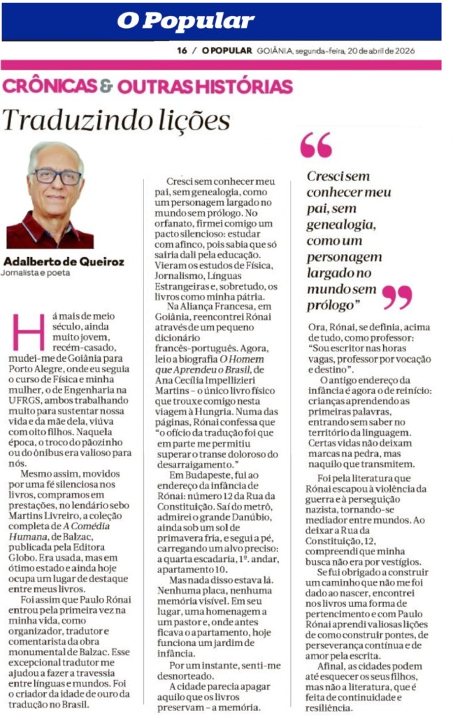 Na Aliança Francesa, em Goiânia, reencontrei Rónai através de um pequeno dicionário francês-português. Agora, leio a biografia O homem que aprendeu o Brasil, de Ana Cecília Impellizieri Martins – o único livro físico que trouxe comigo nesta viagem à Hungria. Numa das páginas, Rónai confessa que “o ofício da tradução foi que em parte me permitiu superar o transe doloroso do desarraigamento.”